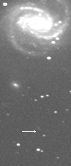 La première images est la sommes de 4 images initiales (nous voyons alors une trainée) et finalement l'animation de droite est tous simplement un GIF animés. Nous voyons un astéroide se déplacant vers le haut de l'images. Il est possible de verifier grâce à Internet si l'astéroide en question est connu. Apres verification avec le MPC (Minor Planet Center, opéré par la Nasa) aucun objet étaient présent dans cette partie du ciel pour cette heure.