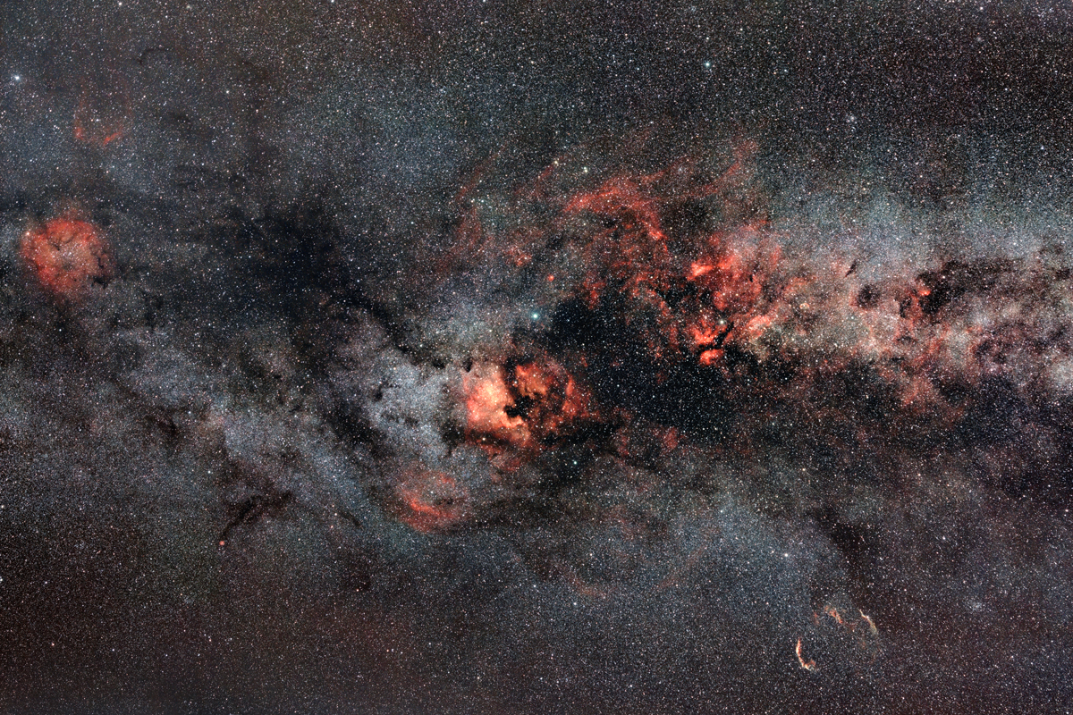 Voie-Lactée dans la région du Cygne avec les principales nébuleuse. NGC 7000 au centre.